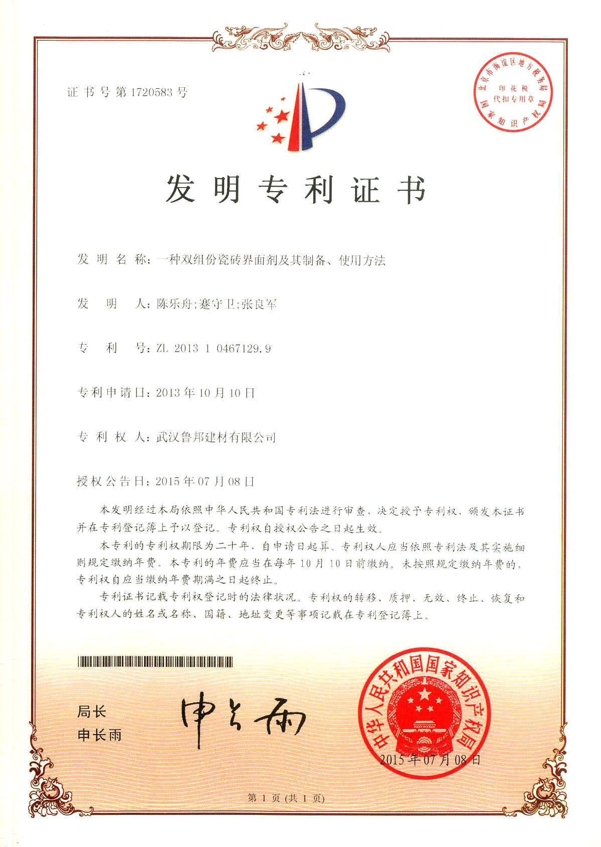 本產(chǎn)品是湖北魯邦建材股份有限公司技術(shù)研發(fā)中心開發(fā)的一種擁有國家發(fā)明專利(專利號(hào):ZL2013104671299)的新型瓷磚粘結(jié)界面材料,由國際大品牌高分子聚合物及優(yōu)質(zhì)改性劑復(fù)合精制而成,能極大的釋放大部分?;u等高密度低吸水率磚與粘結(jié)材料之間的應(yīng)力,明顯的提高?;u等高密度低吸水率磚的粘結(jié)效果,不易空鼓,不易掉磚,直接解決大磚及高密度低吸水率磚粘貼難的問題。